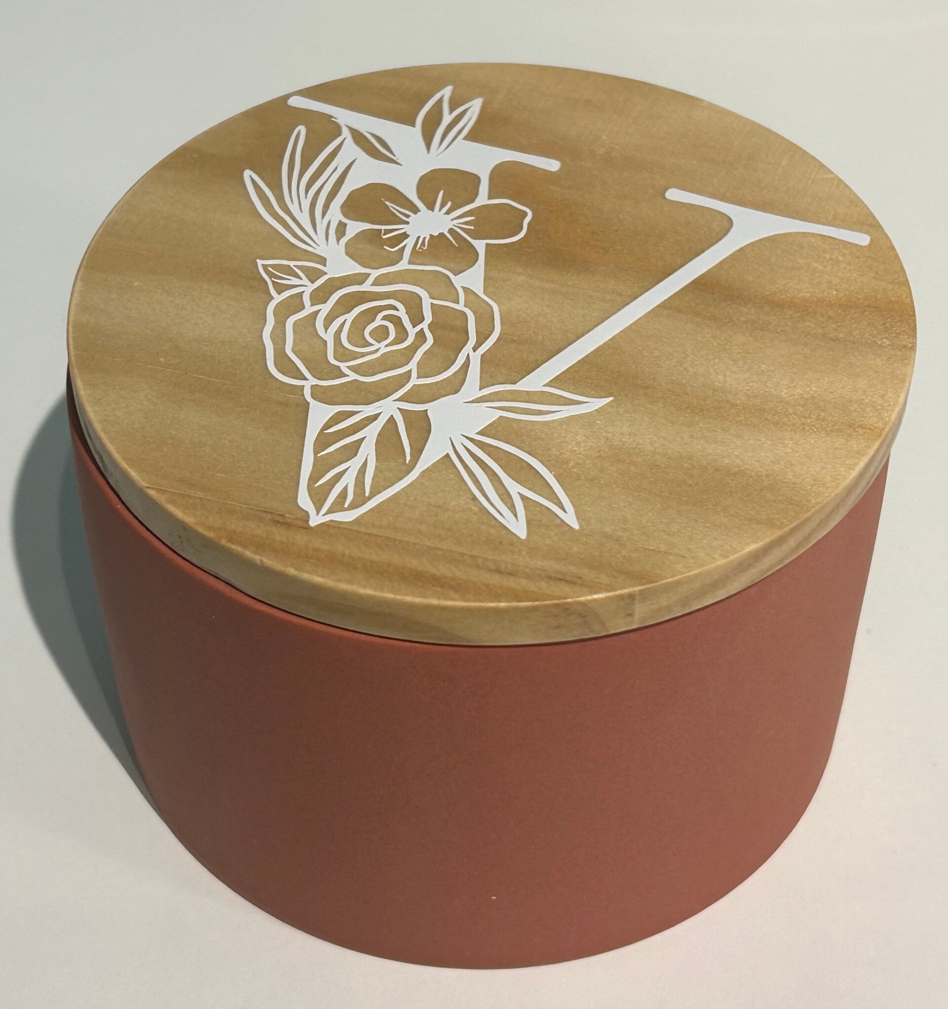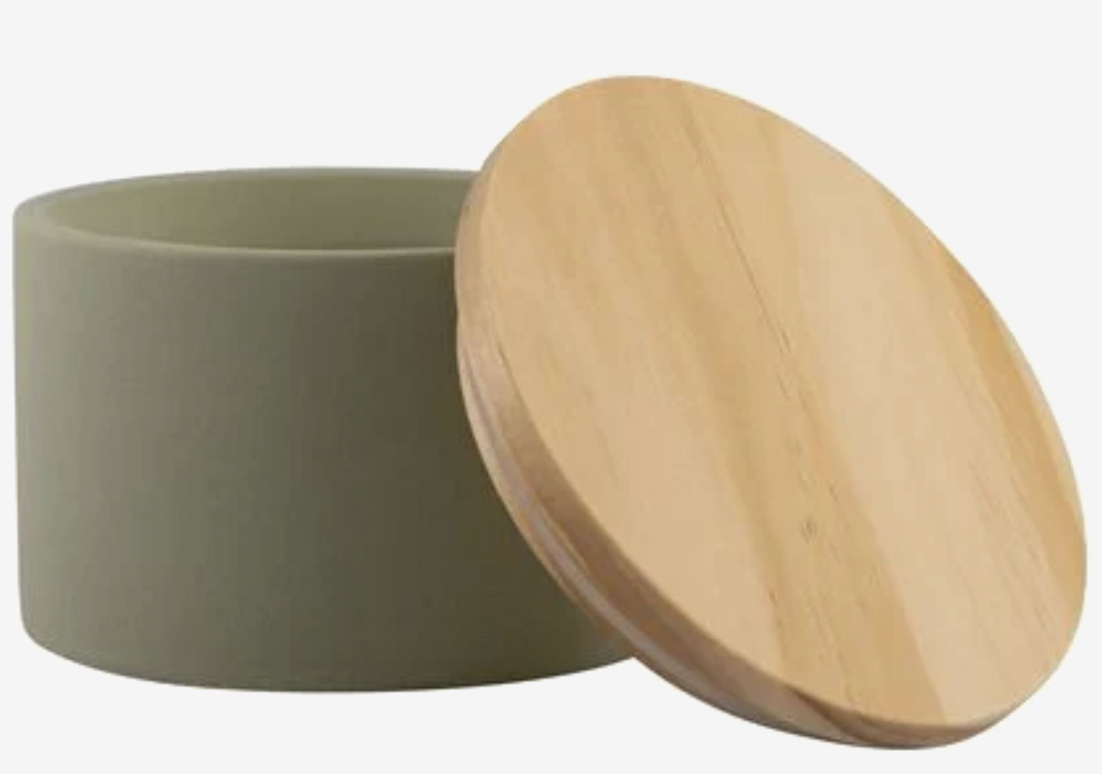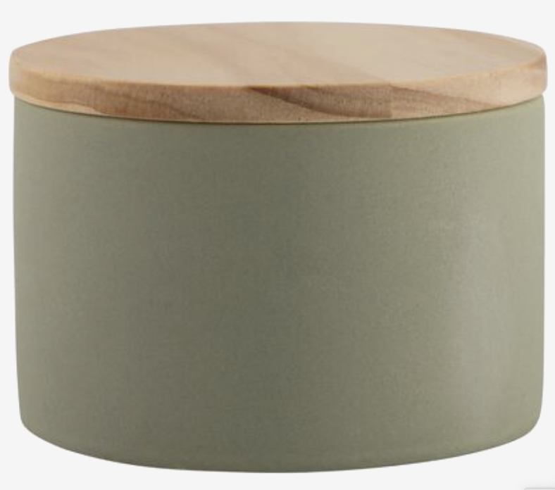 witte kaars met drie lonten in een pot van lichtgroen keramiek, afgesloten met een houten deksel