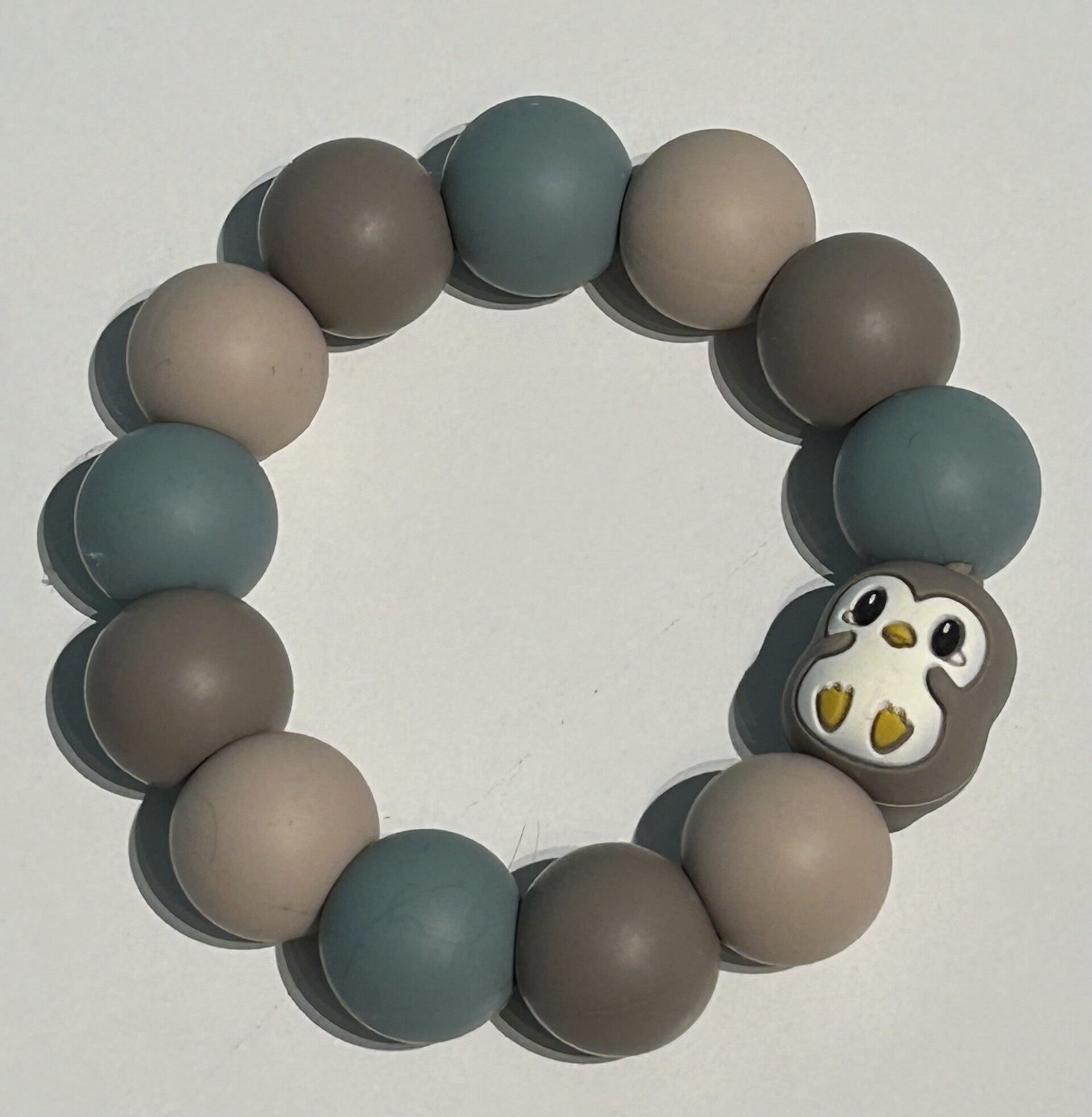 Deze bijtring is gemaakt van siliconen kralen.