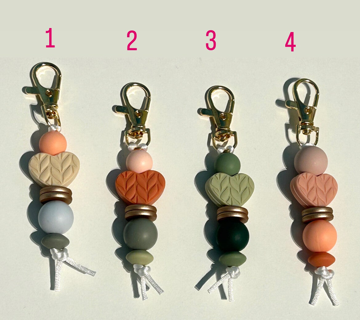 De sleutelhanger is gemaakt van satijndraad en siliconen parels.