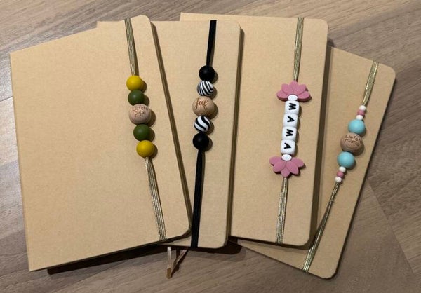 Dit notitieboek is afgewerkt met siliconen kralen.