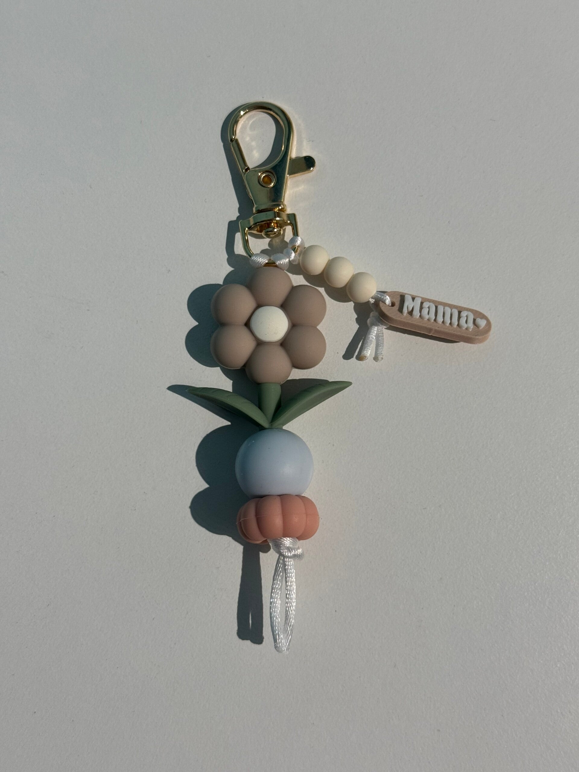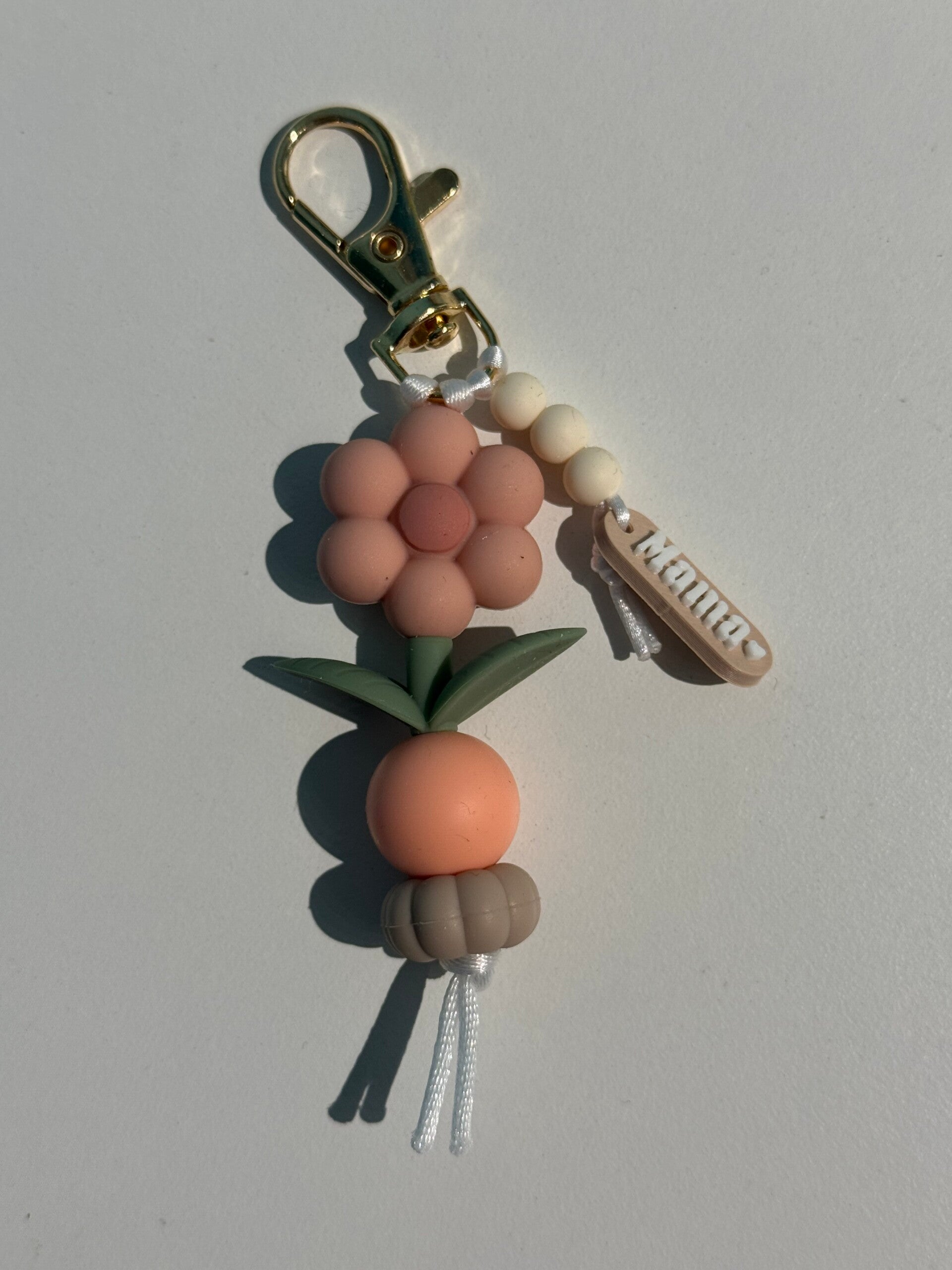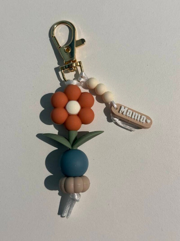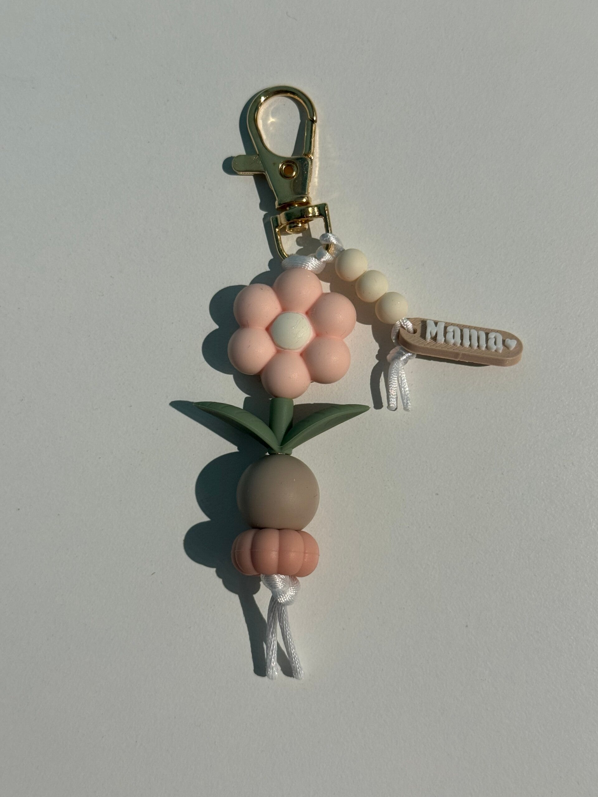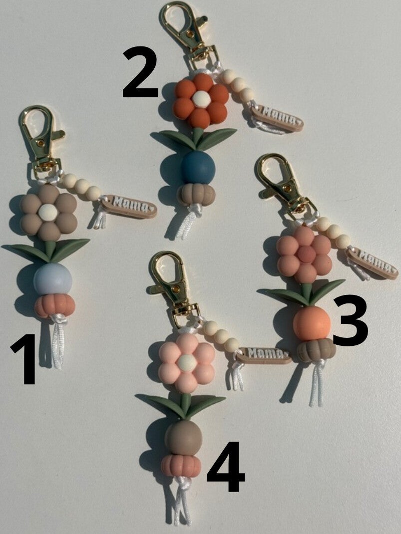 De sleutelhanger is gemaakt van satijndraad en siliconen parels.
