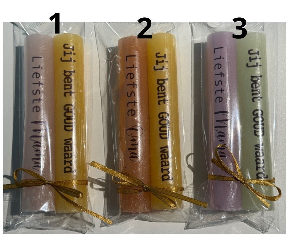 2 gekleurde kaarsen (12 cm) afgewerkt met decaltekst
