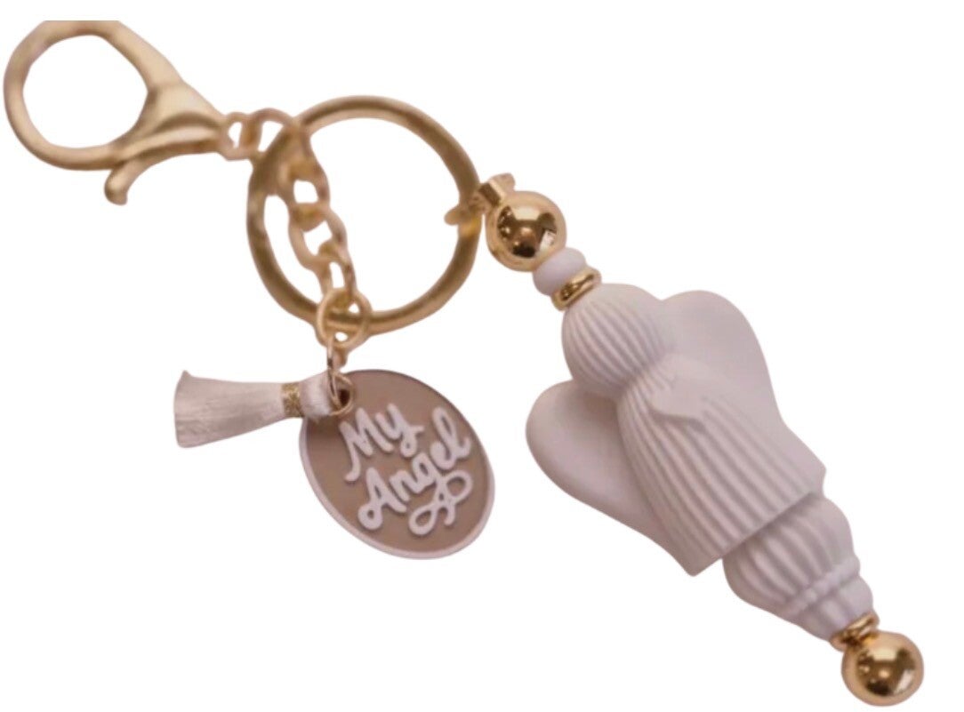 De sleutelhanger is gemaakt van 3d geprinte kralen.