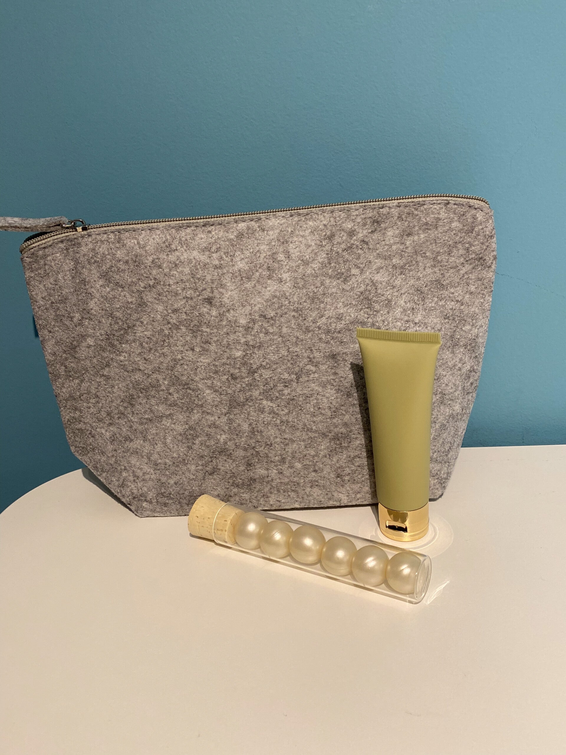 handcreme (zwart, blauw, roze of groen)- tube van 50 ml + toiletzak uit vilt + glazen buisje met 6 badparels