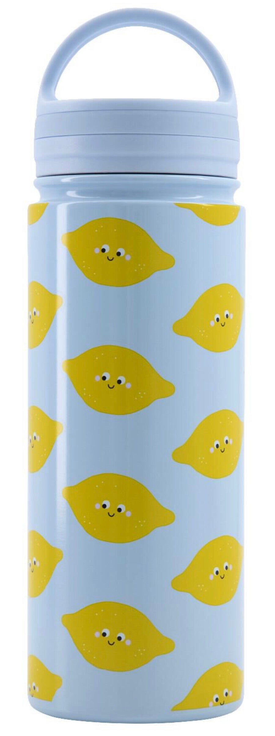 Een lichtblauwe isoleerfles met het dessin van gele citroenen en met een draaidop. De dop heeft een draaghengsel zodat je hem altijd makkelijk met je mee kunt nemen. De rvs fles is geschikt voor zowel warme als koude dranken. De warme inhoud blijft hierin 6 uur lekker warm en de koude dranken blijven 12 uur koel.